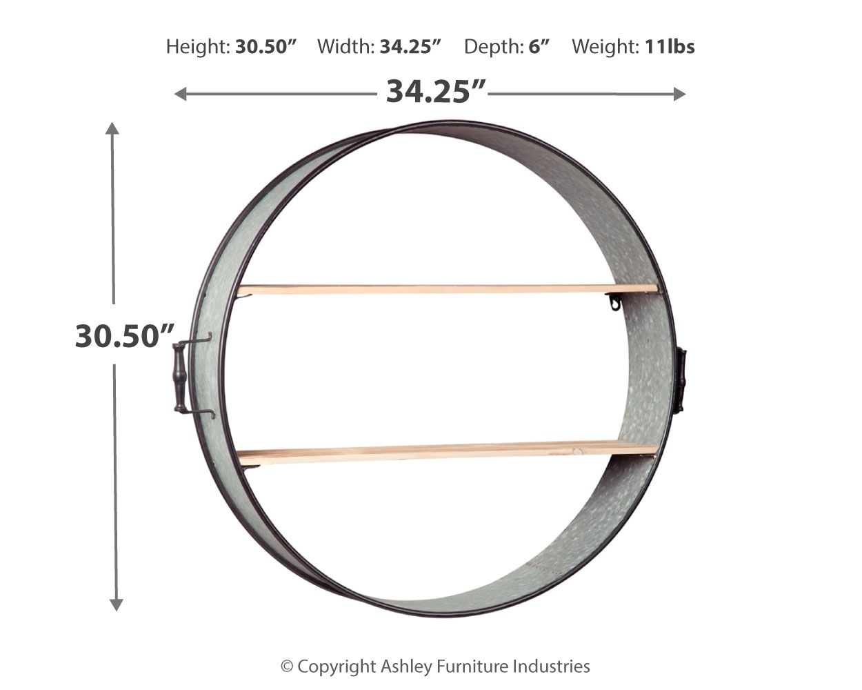 Create extra show-off space by hanging up this wall shelf. Its generously scaled barrel design with wooden shelves puts your decor on display with style. Galvanized metal adds an industrial feel to the look.
