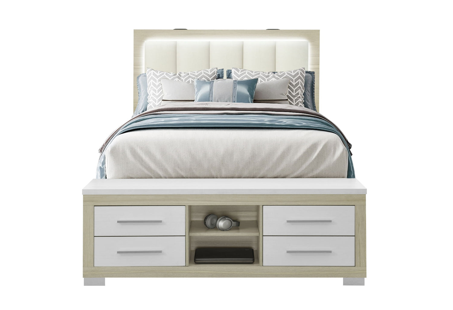 Madison - Queen Bed Headboard With LED, USB, Bluetooth Speaker - Natural / White