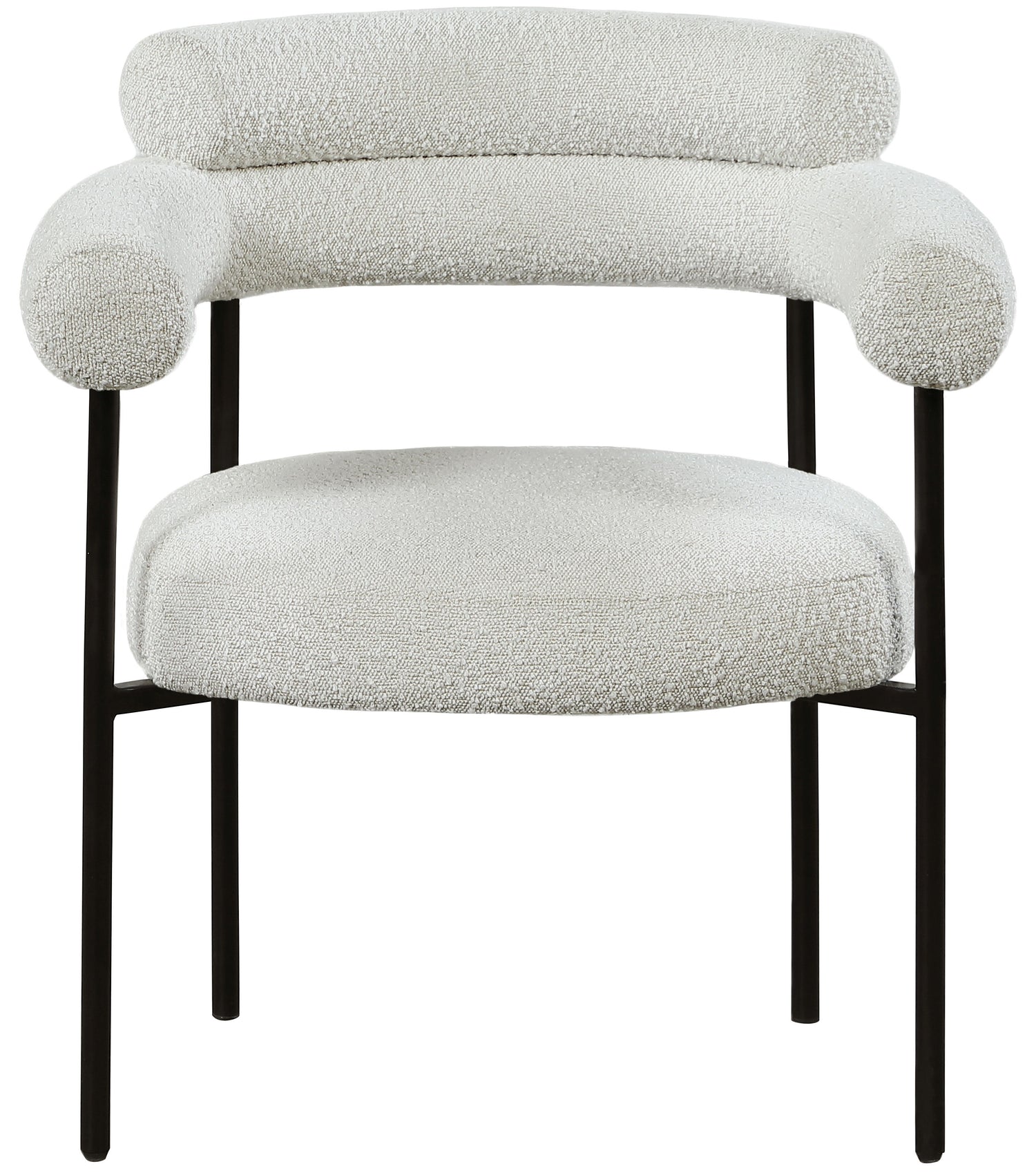 Modernize your dining space with these Blake boucle fabric dining chairs. This pair of contemporary dining chairs features rich boucle fabric, making them comfortable to sit on. Their matte metal frames provide sturdy support so you can relax knowing they ll seat you for years to come. Built to last, these chairs are strong enough for most users. Pair these pretty chairs with your choice of dining table for a custom look.