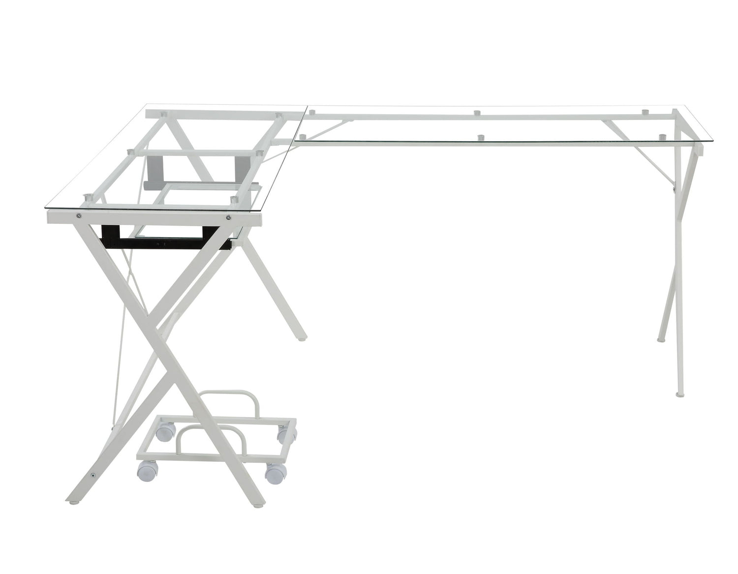 Corner Computer Desk Orientation: "L" ShapeX-Shape Metal Frame BaseRectangular Table Top w/Tempered GlassKey Board Tray IncludedComputer Holder Included