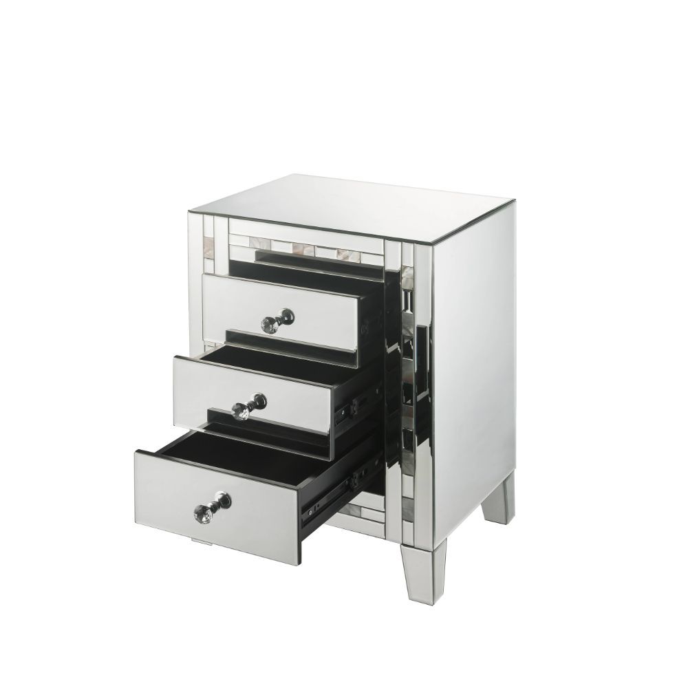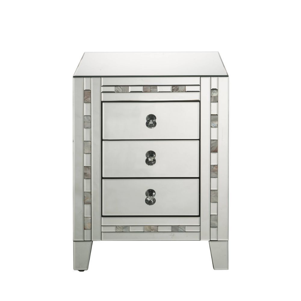 Style and storage abound in the pretty and practical design of the Nasa Side Table. Three drawers offer plentiful enclosed storage for remotes, magazines, or any other items you prefer to keep close at hand. Its three drawers boast crystal knobs and framed by mirrored glass panels with mother pearl stones inlay trim.