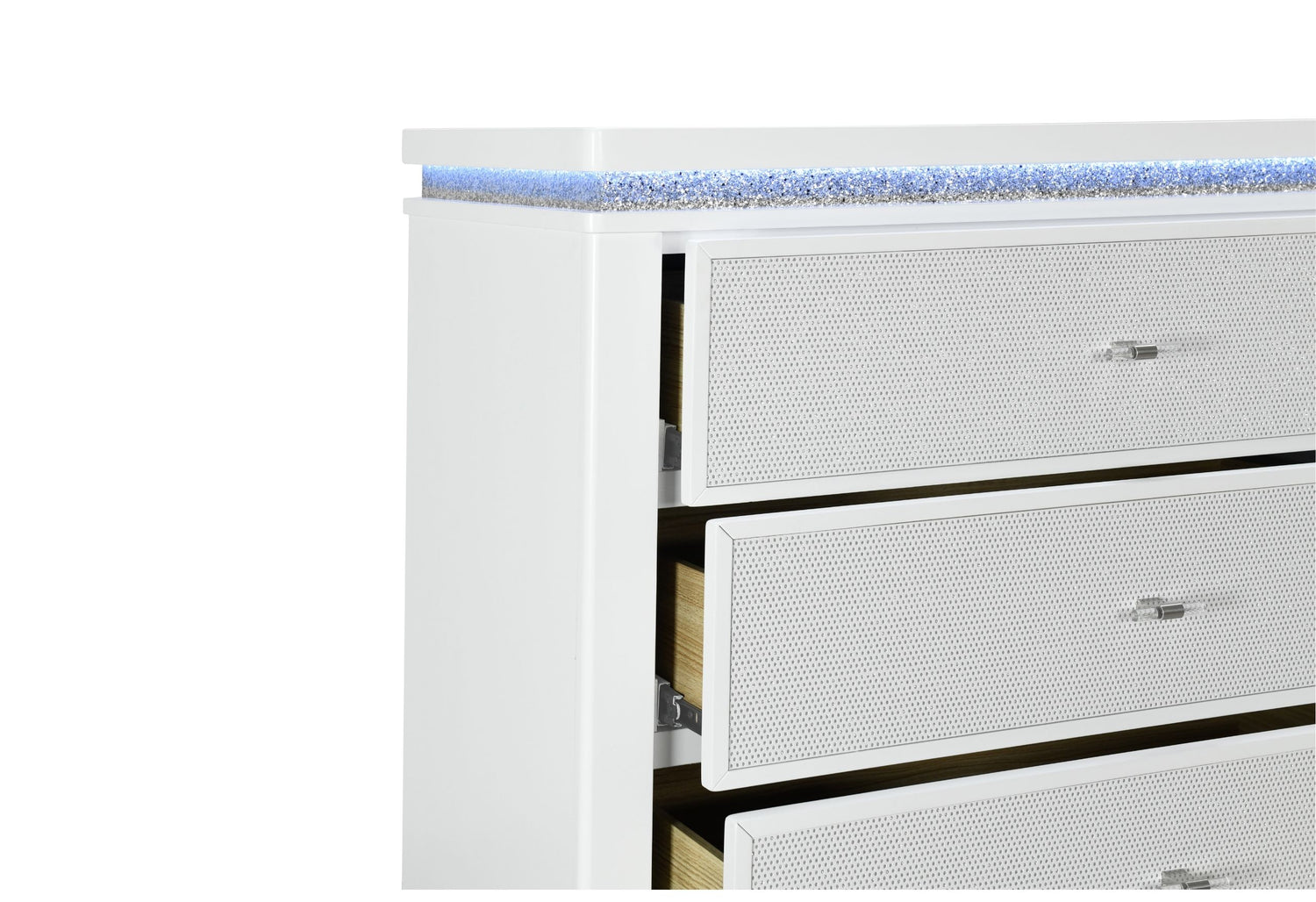 The Alina Dresser is an exquisite fusion of functionality and style. Its white finish harmonizes with LED-lit crushed glitter, while the perforated silver glam drawer fronts provide ample storage space that's as accessible as it is striking. Each pull is a statement of luxury, ensuring your storage solutions are never dull.