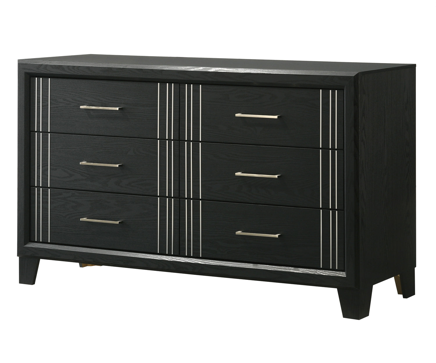 This elegant bedroom collection presents a sophisticated ensemble perfect for creating a refined modern aesthetic in your sleeping quarters. The suite features a sleek, minimalist design with crisp, clean lines and a rich finish that exudes contemporary charm. Anchoring the set is a robust panel bed with a prominent headboard, promising a sturdy and stylish centerpiece. Flanking the bed are complementary case pieces, offering ample storage with their smooth-gliding drawers accented with chic silver-toned hardware.