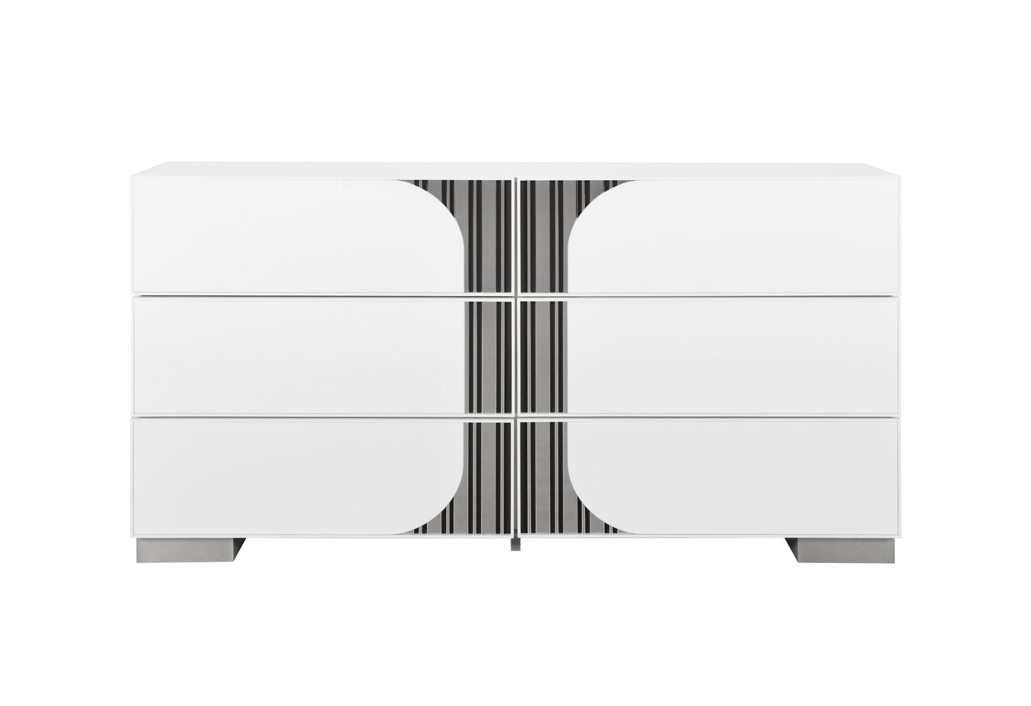 The Talia Dresser offers ample storage with its textured drawer fronts, making it both practical and stylish. Finished in a sleek white with chrome accents, it complements any modern bedroom decor.
