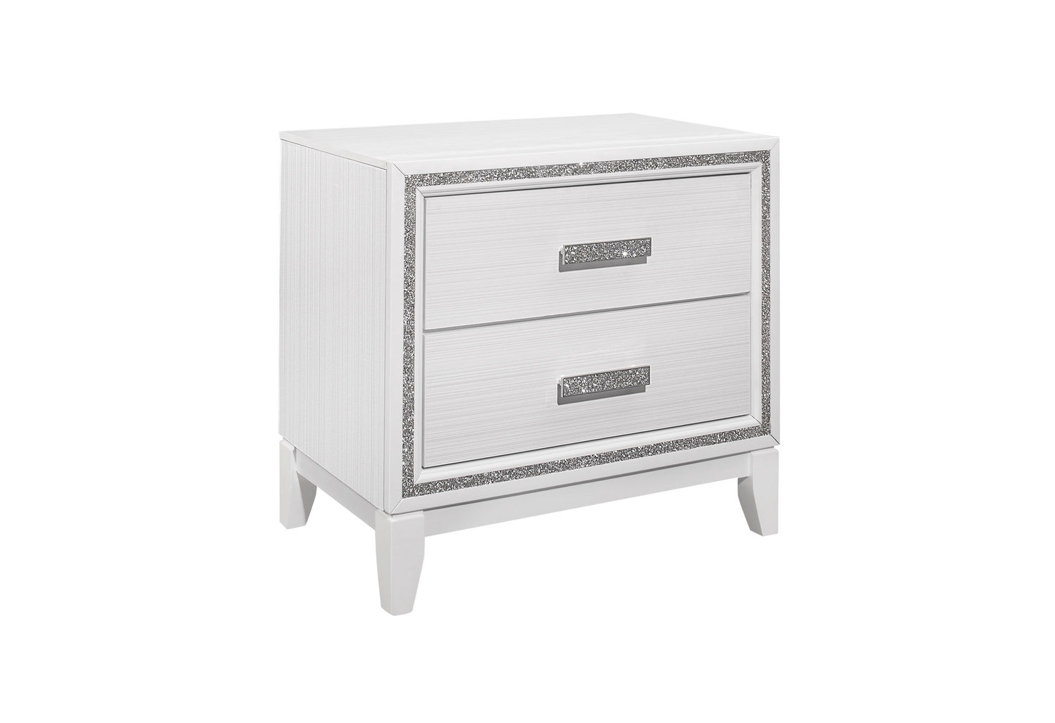 Lily bedroom brings two worlds together. The classic lines and modern accents create a beautiful transitional glam bedroom look. The crushed crystal like look outlines all the pieces along with LED lighting accenting the head board. The crushed crystal like design is not only used as an accent trim but is also carried over to the hardware. The end result is a beautiful glam bedroom.