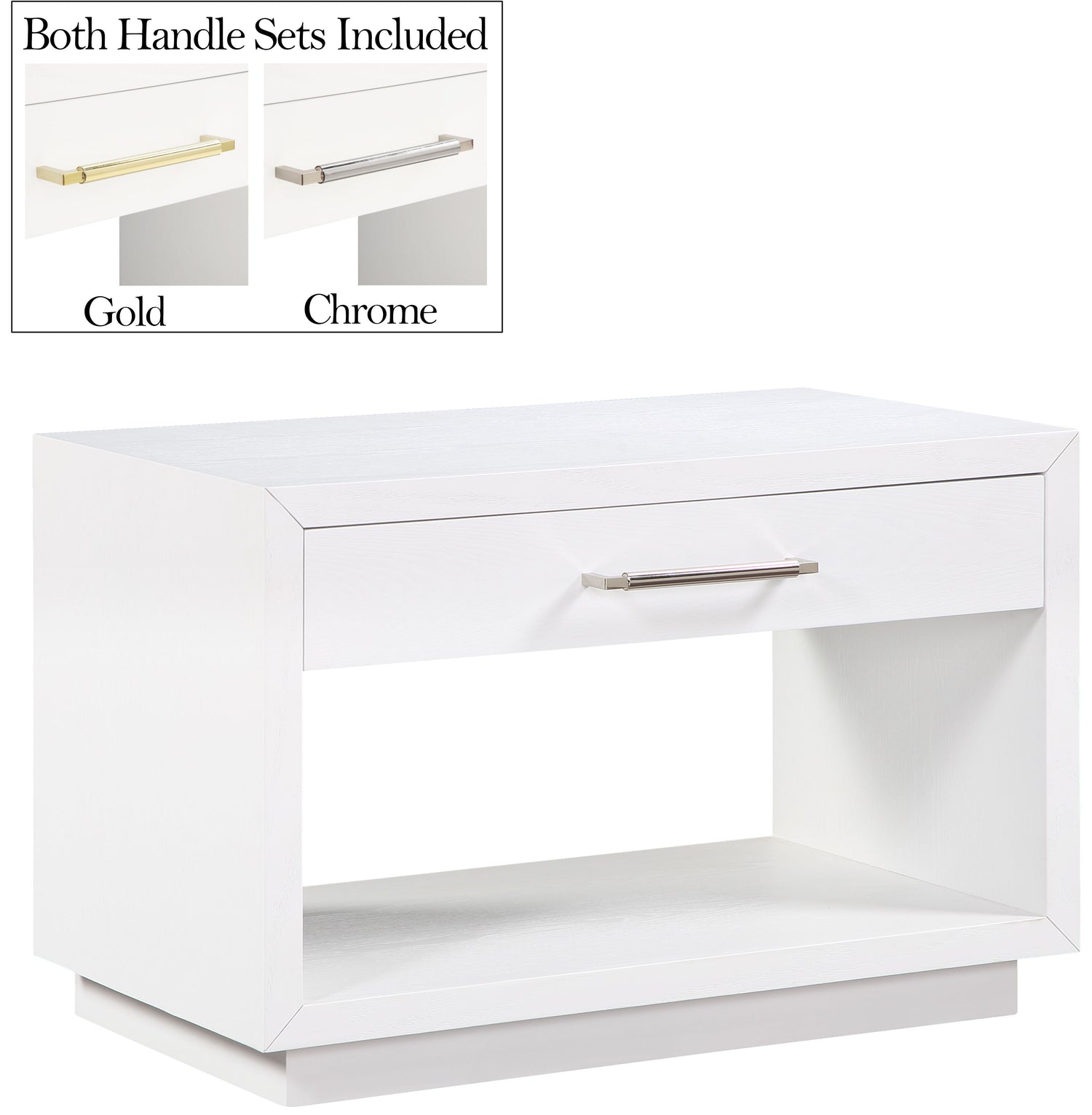 Give your room a makeover with this Avery wood veneer night stand from Meridian Furniture. This open-spaced, rectangular night stand features rich ash wood veneer finish, ensuring it complements your existing bedroom decor. A small drawer in the front provides you with extra space to store reading glasses, nighttime reading material, and more.