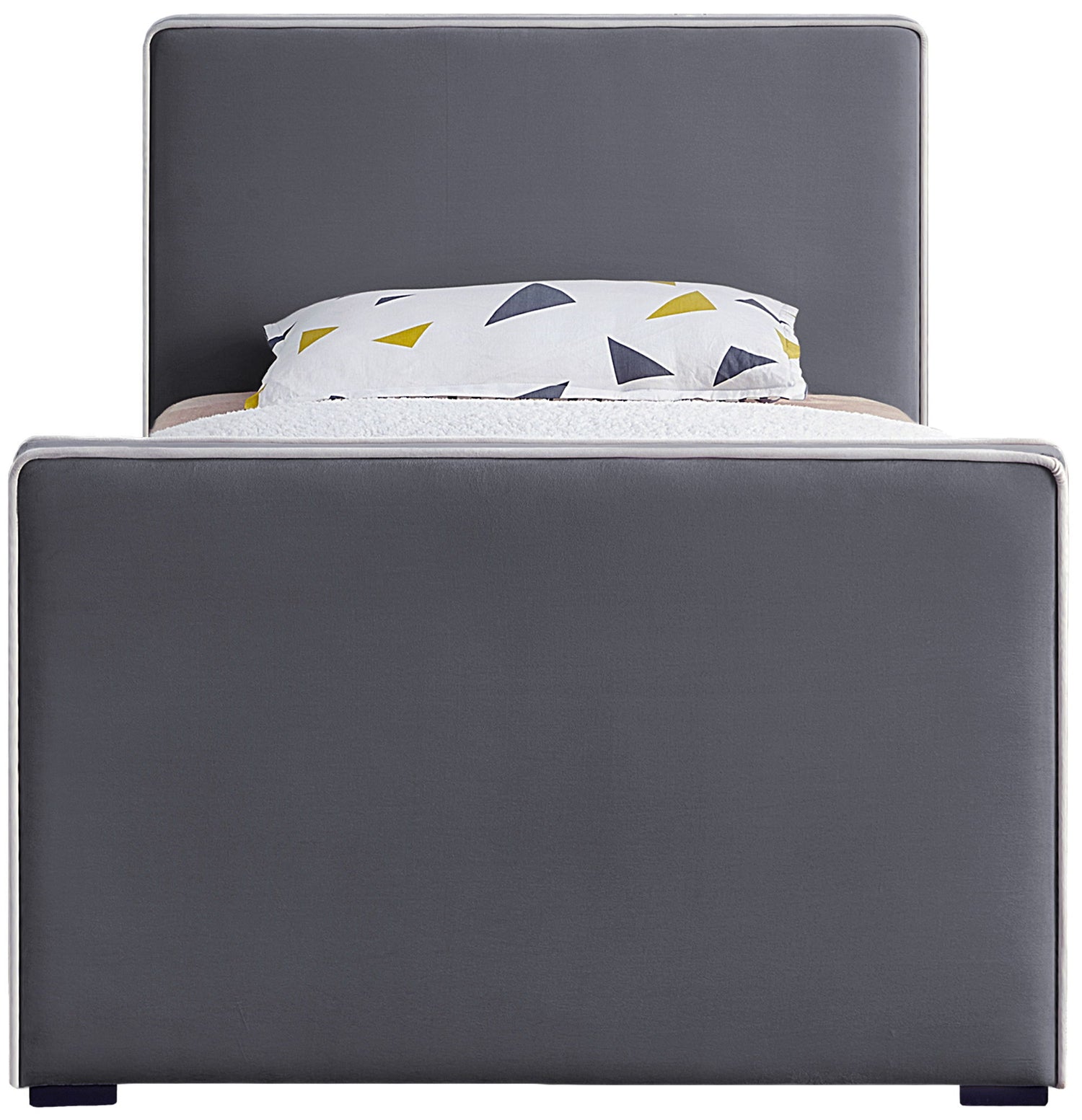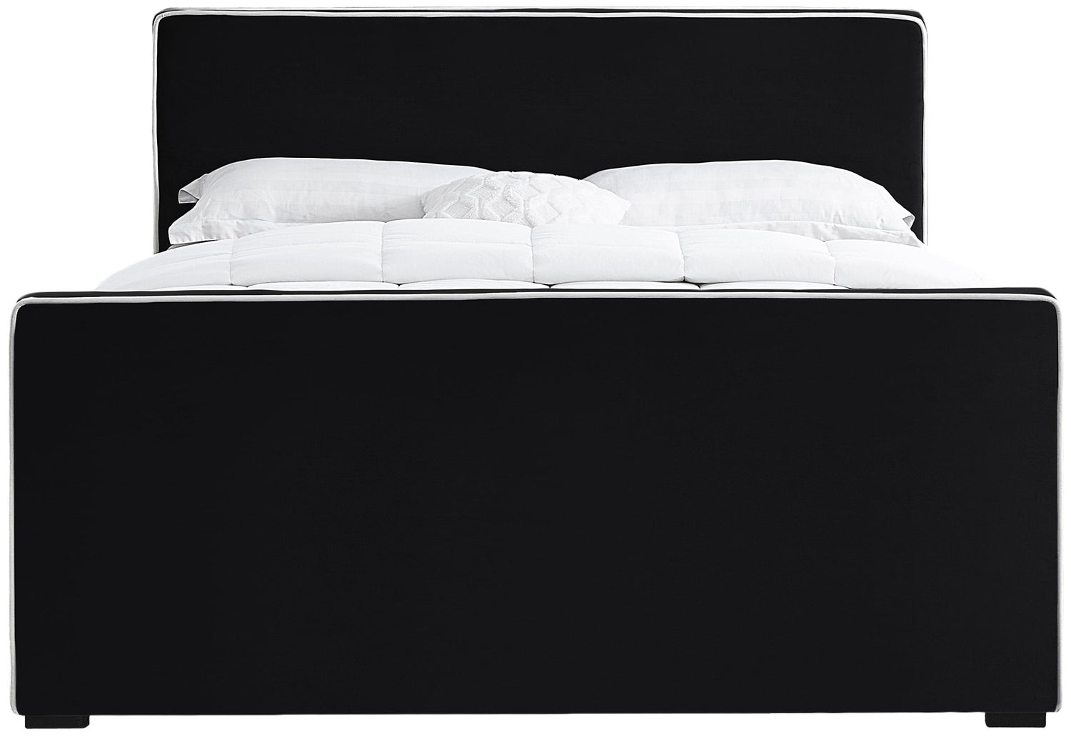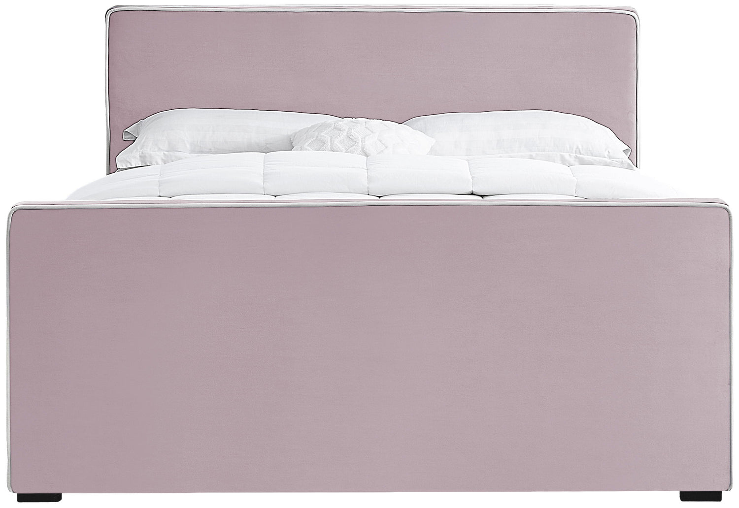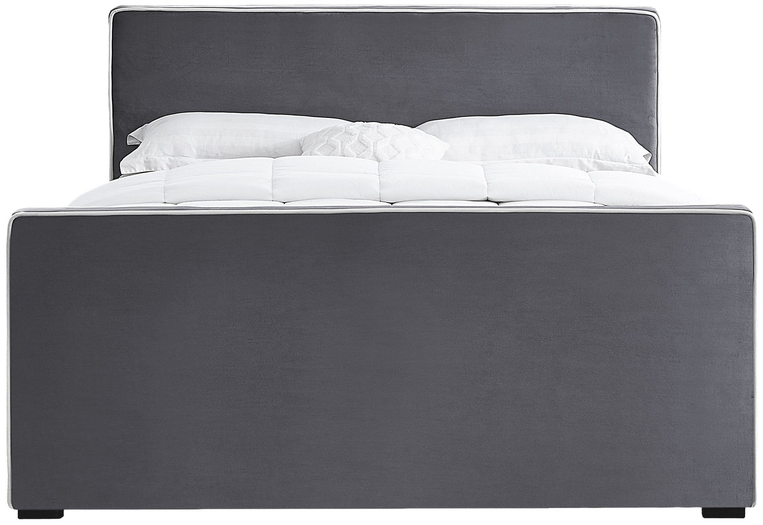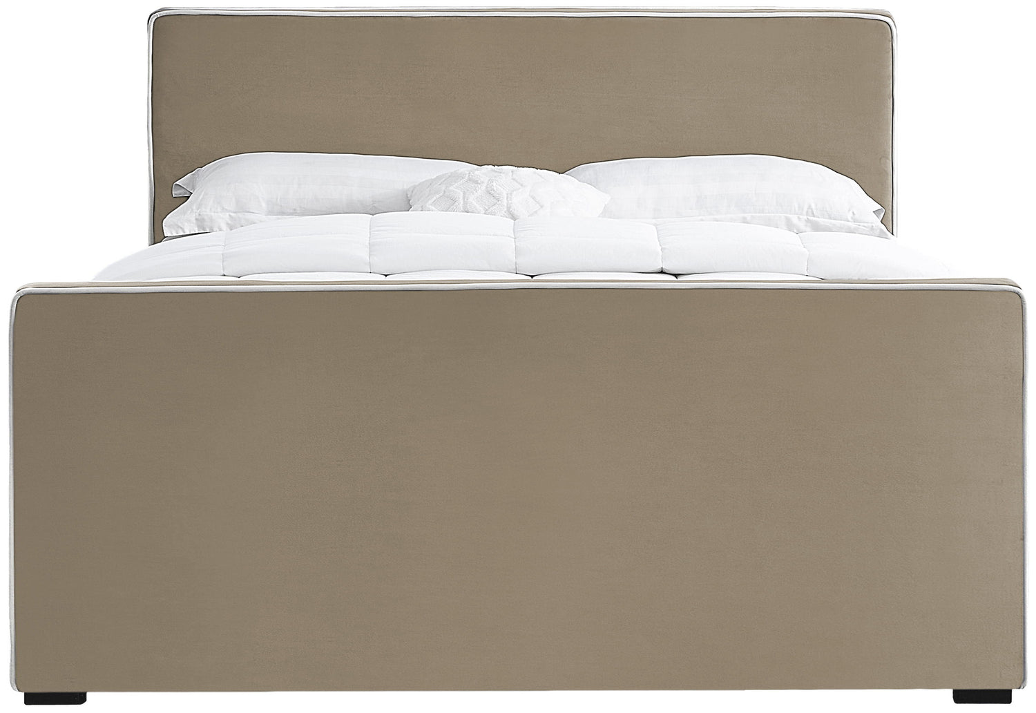 Lend your bedroom an elegant look with this Dillard velvet bed. Live out your velvet fantasy with this bed's soft beige velvet upholstery that runs the full length of the bed from headboard to footboard and is trimmed with velvet piping in a contrasting color for a contemporary vibe.
