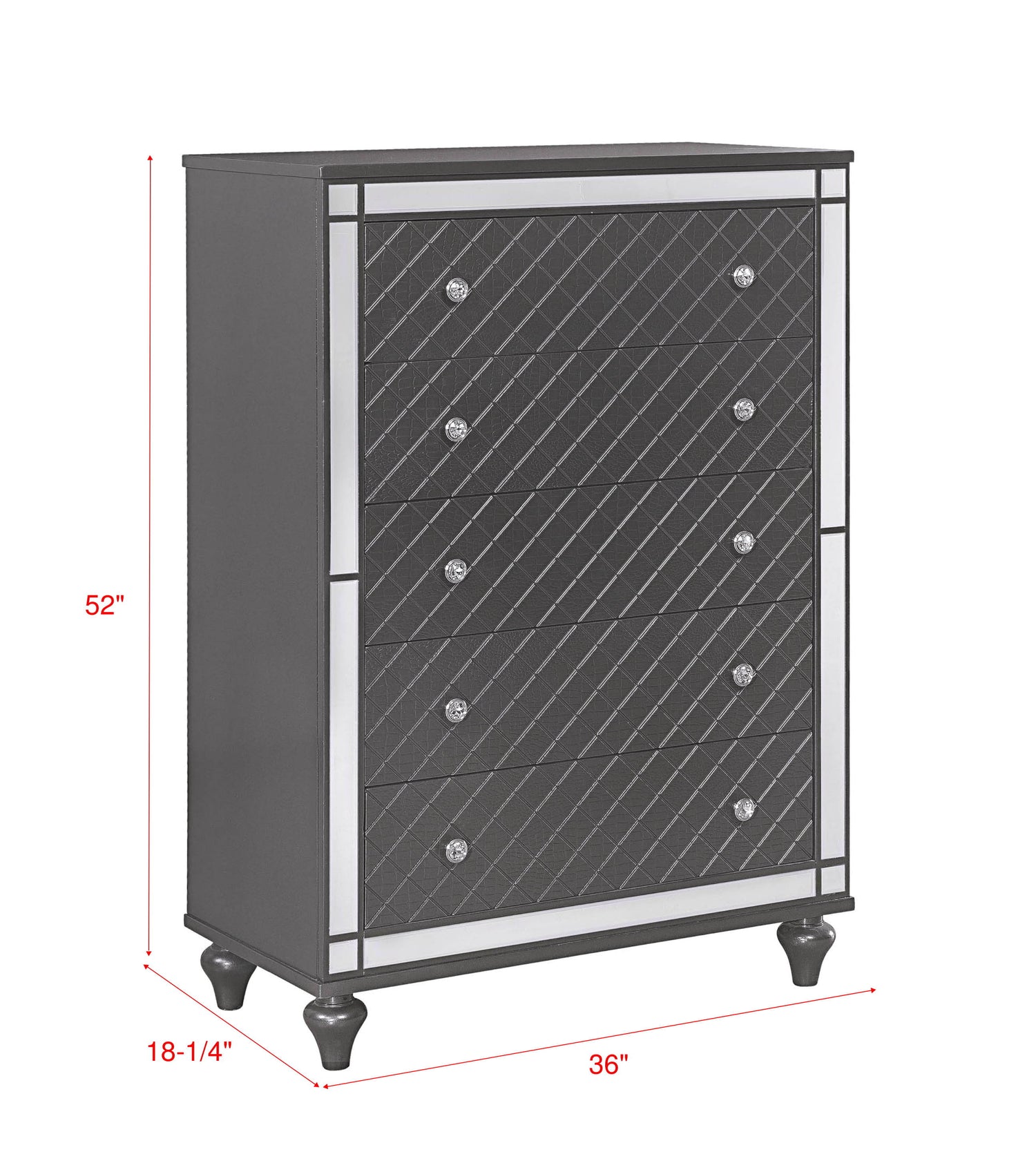 Elevate your sanctuary with this dazzling bedroom collection, where contemporary chic meets timeless charm. The suite boasts a stunning graphite finish, imbuing your space with an air of sophistication and modern luxury. At the heart lies a plush, tufted bed that invites you to indulge in comfort, highlighted by integrated LED lighting. Ample storage solutions are provided through sleek, lined dressers and nightstands, where functionality meets finesse.