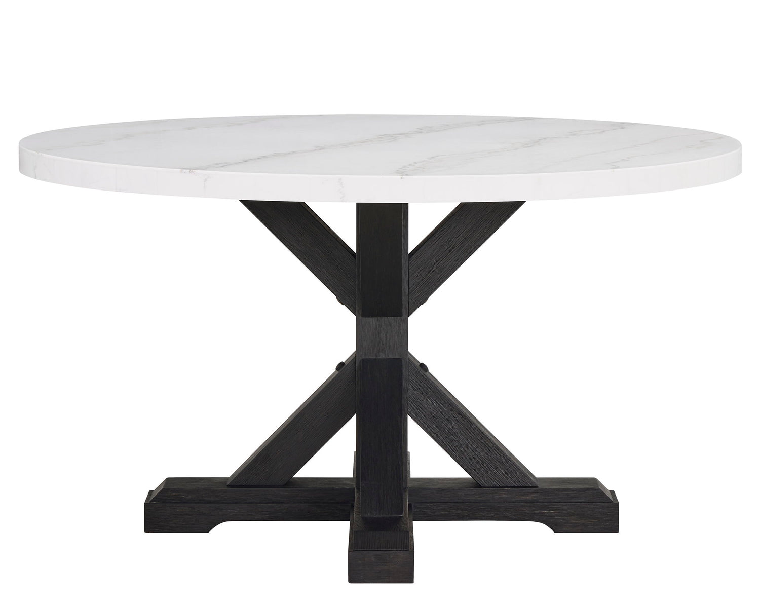 A fresh take on a traditional silhouette makes this group a great addition to your dining space. A genuine marble top is luxurious and timeless. Farmhouse style cross legs are updated in a contemporary charcoal finish. The upholstered dining chairs feature gently sloped wings and a nail head trim on the back.