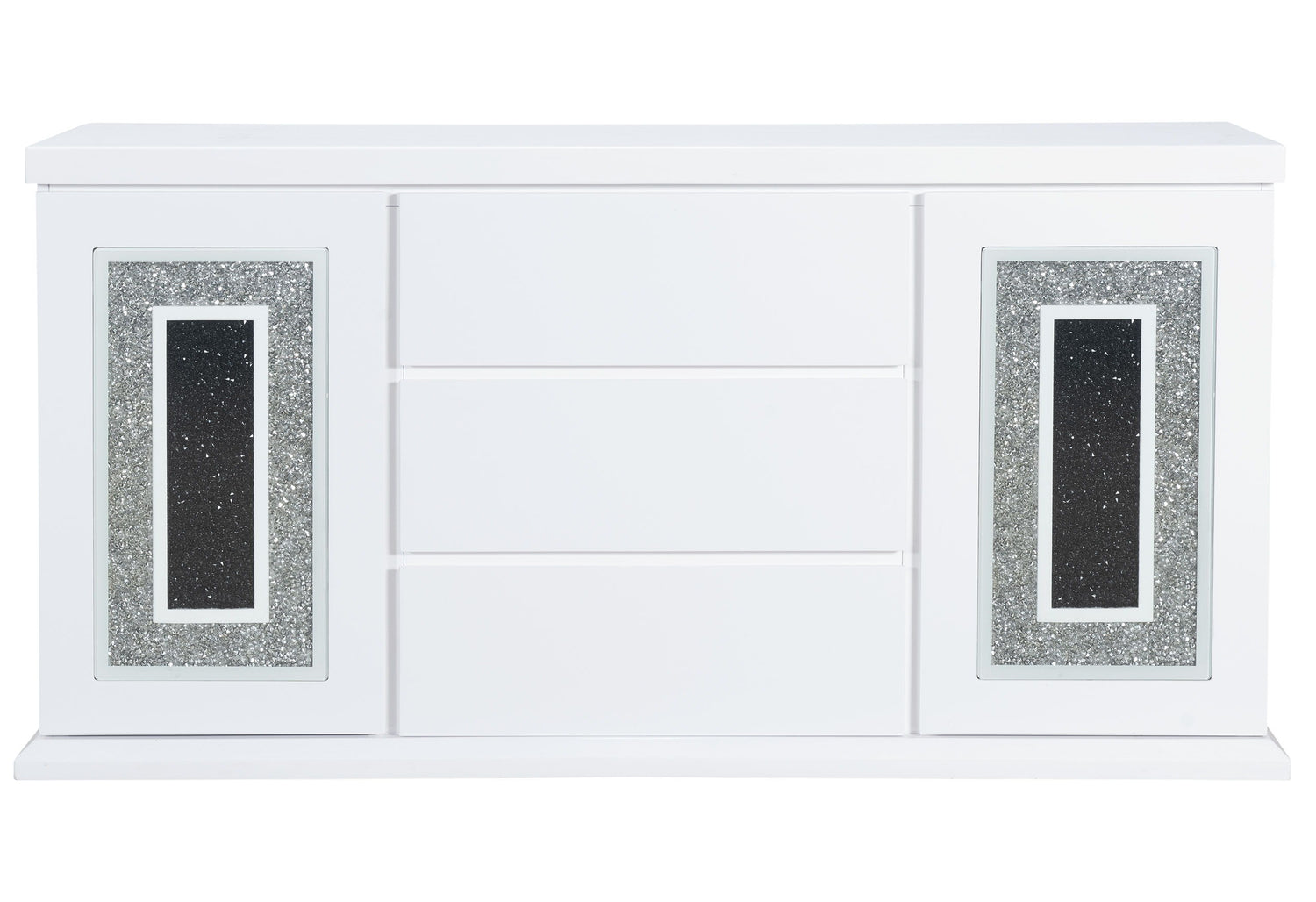 This buffet is a showcase example of how charm and a touch of elegance can dramatically change the look of your eating area. This buffet includes glitter detailing style elements with a sturdy construction and a high gloss finish with a clear glass inlay to round off the look. Constructed of MDF, Glass and Acrylic this buffet makes a bold statement.