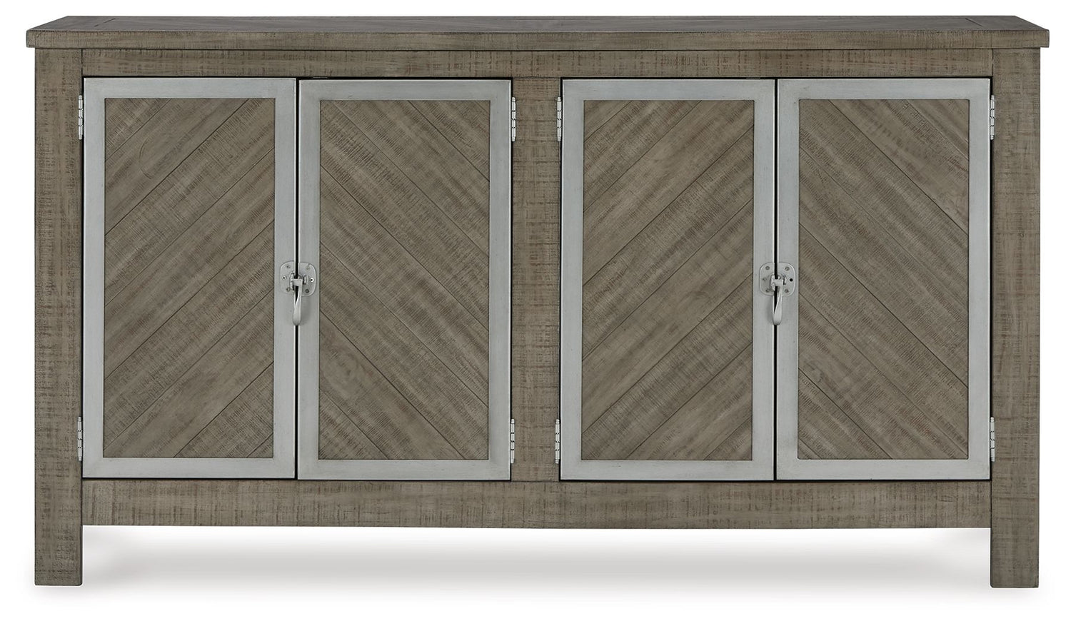 The use of mixed materials on this urban-inspired double buffet makes it a true statement piece. Made of wood with metal accents, this buffet features two spacious cabinets, each with an adjustable shelf and metal framed doors with trend-right window latches. A complex blend of stains and glaze create a weathered gray finish for a relaxed and harmonious update to your home.