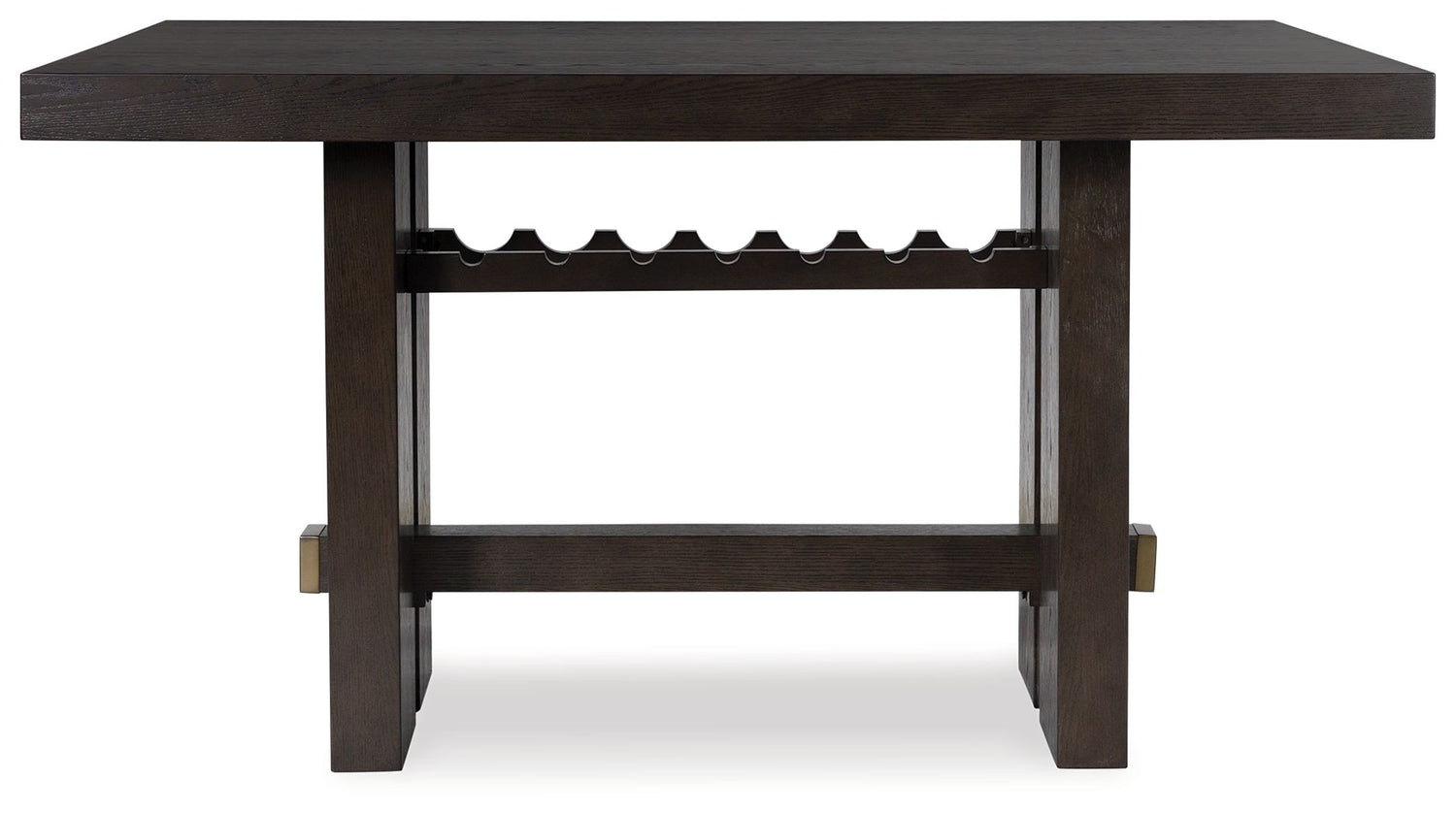Dressed to thrill, this counter height dining table offers a high-design look at a down-to-earth price. Ultra-sleek lines are accentuated with a dark waxy brown oak-tone finish that’s so easy on the eyes. A thick tabletop and a pedestal base with integrated wine rack showcase quality craftsmanship and attention to detail. Clean-lined and modern, this timeless table has a look that’s made to last.