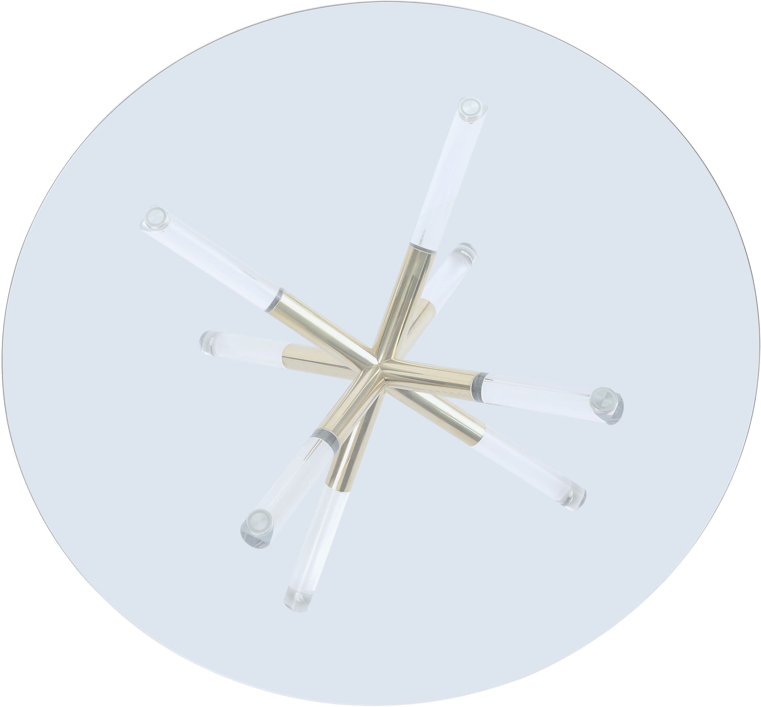 Bring modern pizzazz to your living room with this Mercury Acrylic Gold Dining Table by Meridian Furniture. The base features a pedestal design with acrylic gold legs for a touch of contemporary fun. The tempered glass top offers plenty of room for seating guests for intimate meals together. The top is clear, so you can easily see the beauty of the metallic legs showing through, giving your living room or den a little something extra.