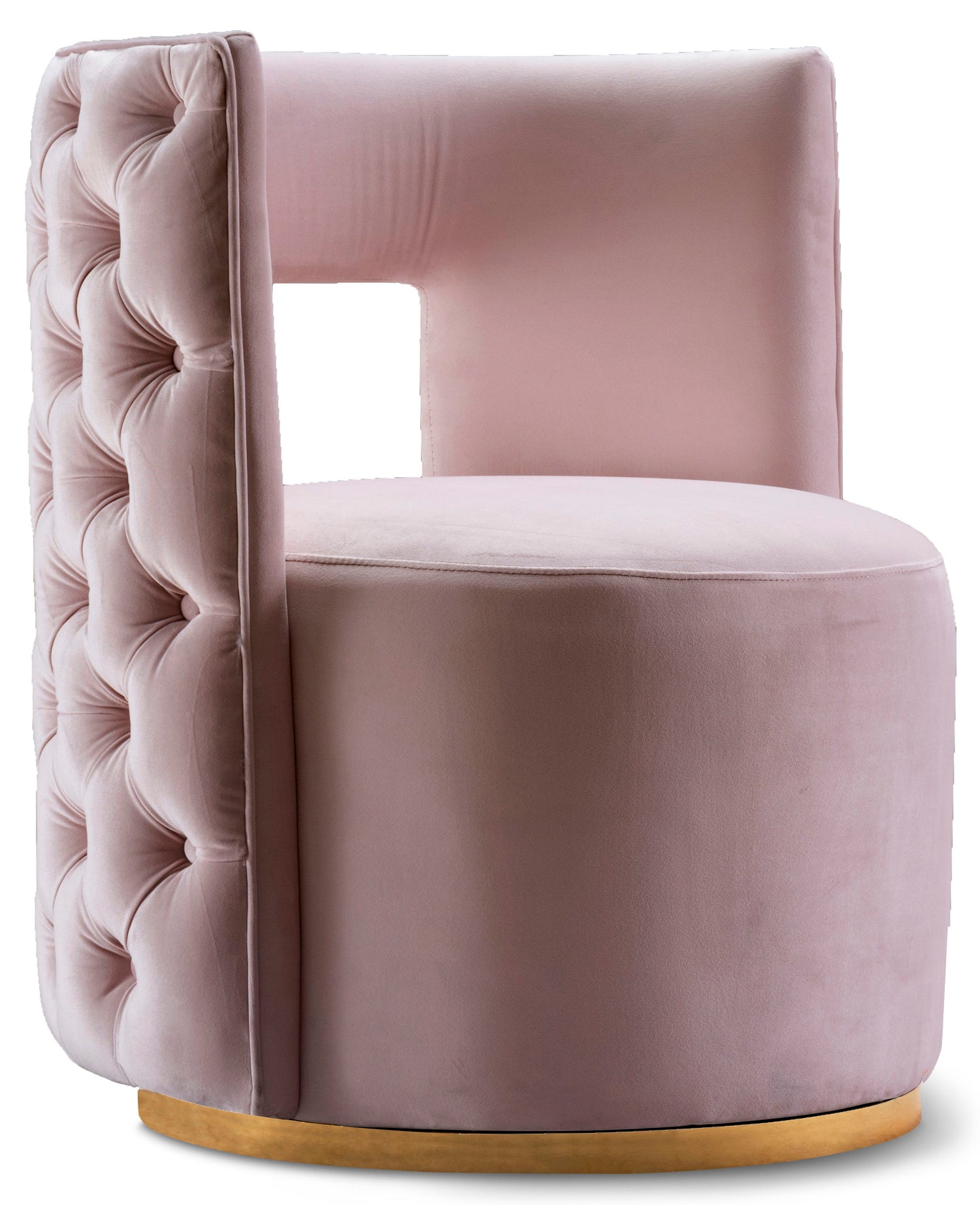 Complement your contemporary decor with this Theo Accent Chair from Meridian Furniture. Featuring a contemporary design with button tufting on the back, this chair is sure to immediately draw the eyes of all who enter your home. velvet upholstery makes this chair luxurious to sit in, and the opening in its back ensures ample air flow while you curl up with your favorite book or in front of the TV. Its swivel base accentuates its velvety dark color, while allowing you to turn whichever way you choose as you recline.
