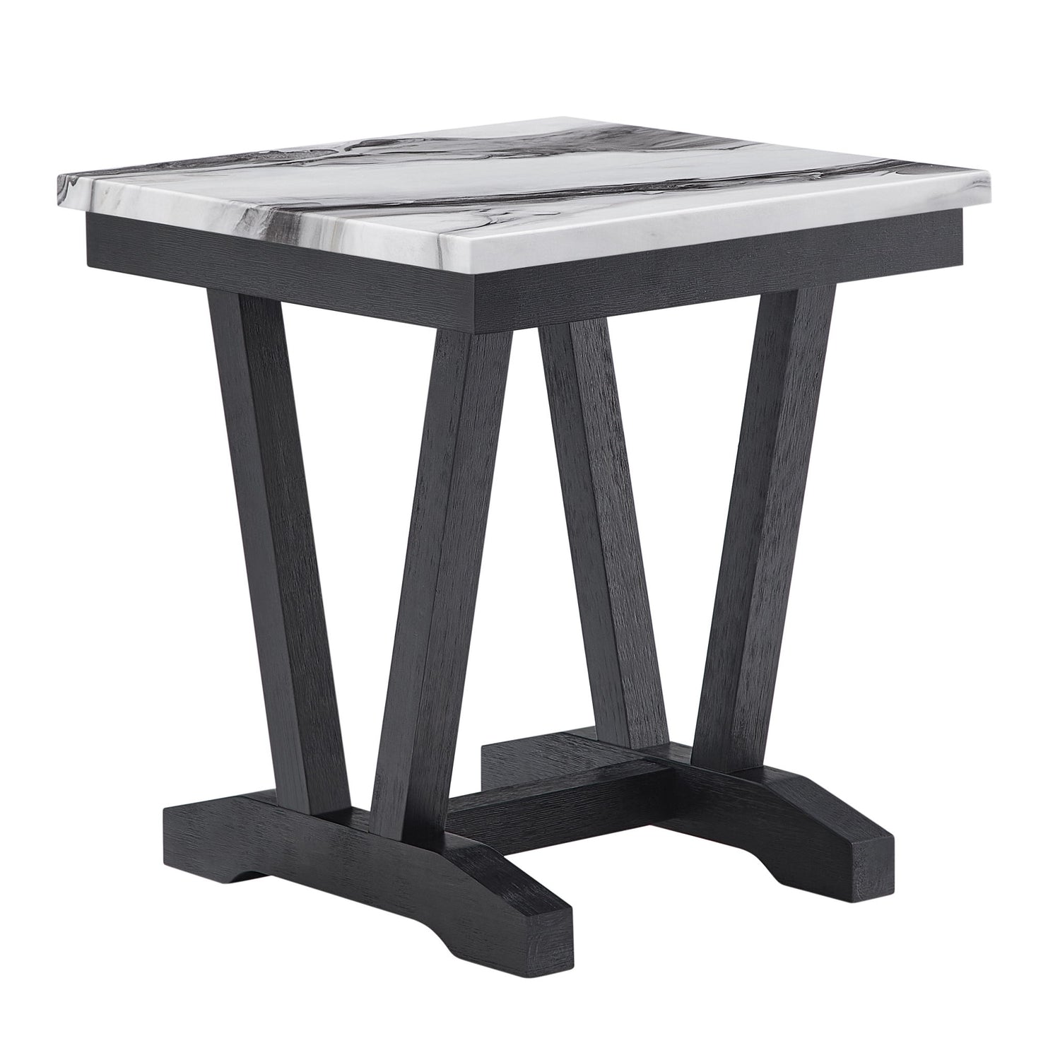 Indulge in contemporary luxury with the T1319 End Table, a statement piece that effortlessly anchors your space in style. The table top is adorned with a stunning faux panda marble paper finish that mimics the exquisite patterns of natural marble, adding opulence without the hefty price tag. The clean, straight lines of the black wooden legs create a sturdy frame, ensuring stability and durability while contributing to the minimalist aesthetic. This table is not only a visual delight but also a practical surface for your social and dining needs.