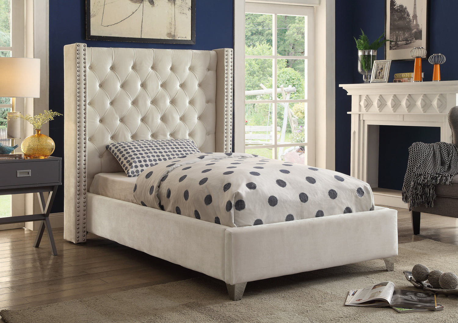 Elegant and eye-catching, the stunning Aiden Bed from Meridian Furniture is the perfect addition to any bedroom. velvet covers the deep tufted design. A beautiful wing bed design is complimented by hand applied nail head details. Strength and beauty is guaranteed with a solid wood frame and stainless steel legs.