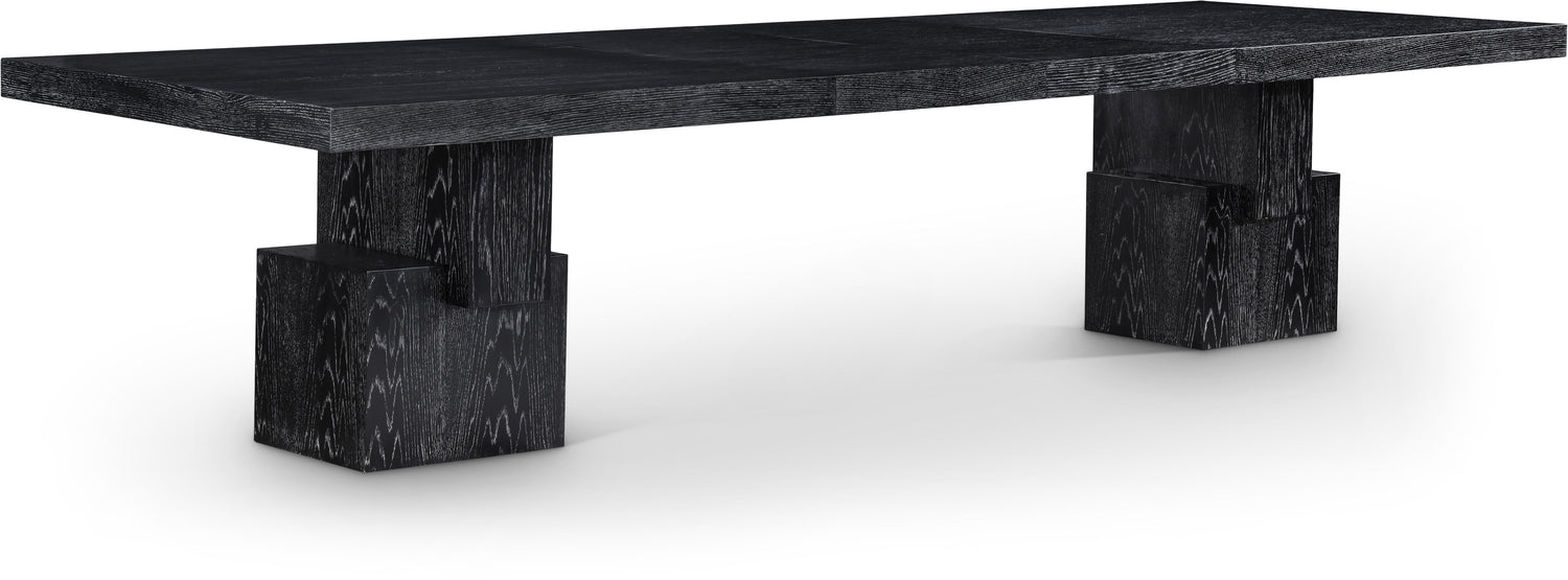 Wow guests with the artsy charm of this Anzio oak dining table. This table has a decidedly utilitarian design that makes it a no-brainer for minimalist decor while its simple lines and unexpected style elements ensure that it's the center of attention in your modern dining area. Oak veneer construction lends a rugged, rustic vibe to the table, which comes equipped with two leaves so that you can make it smaller or larger depending on the crowd you're entertaining.