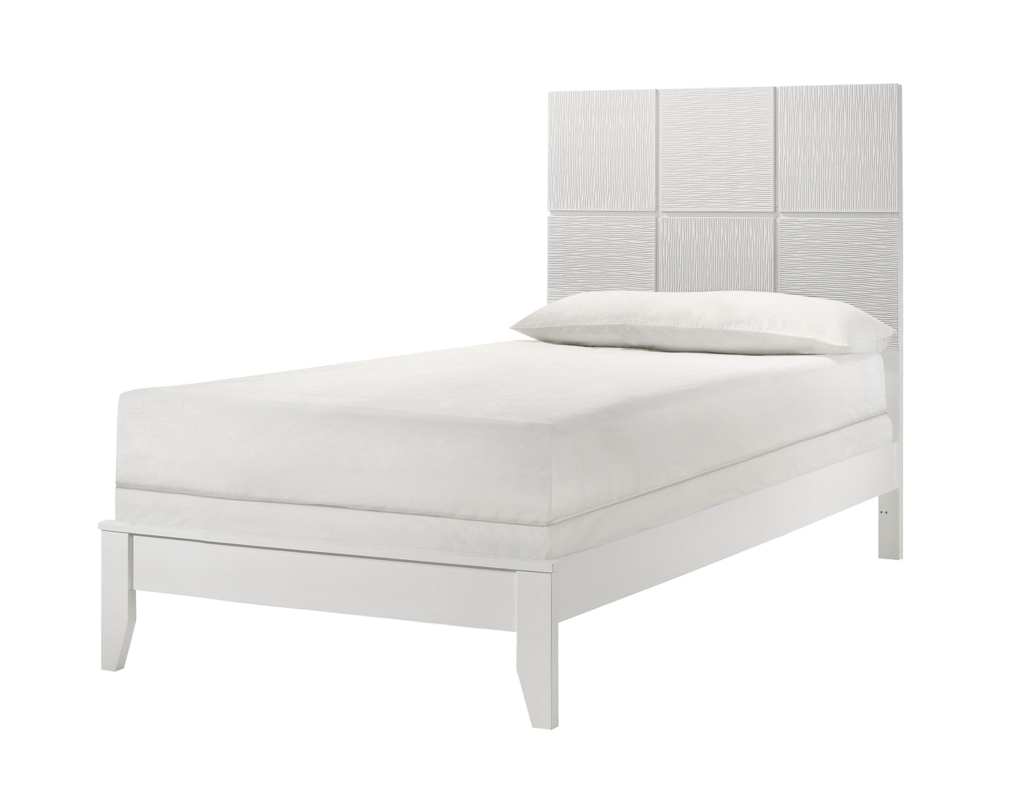 This bedroom collection is the embodiment of sleek, contemporary design, characterized by its rich finish and distinctive textured front panels. The centerpiece, a chic bed with a statement headboard, features geometric paneling that adds depth and interest. Flanked by a matching nightstand and complemented by a spacious dresser with a minimalist mirror, the set offers both style and utility. The clean, linear hardware harmonizes with the set's modern aesthetic, providing a subtle metallic contrast.
