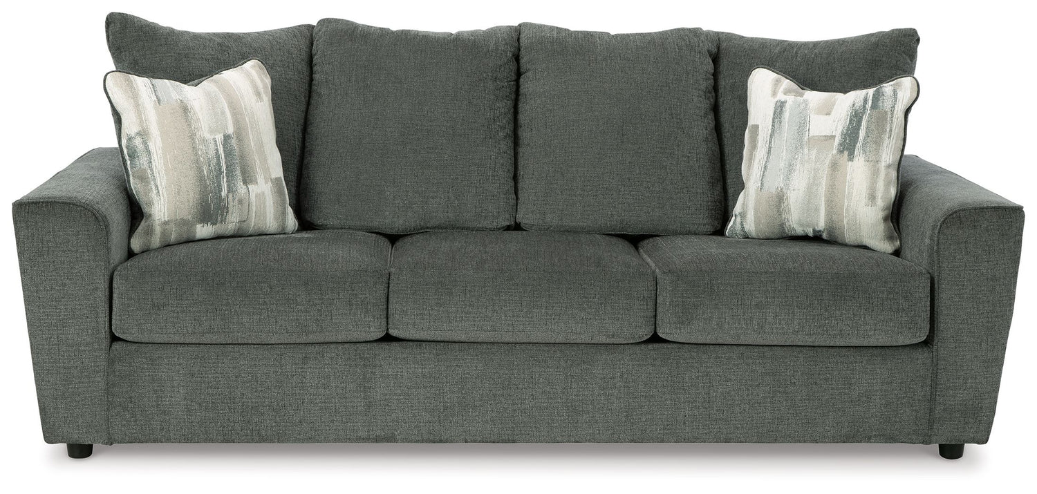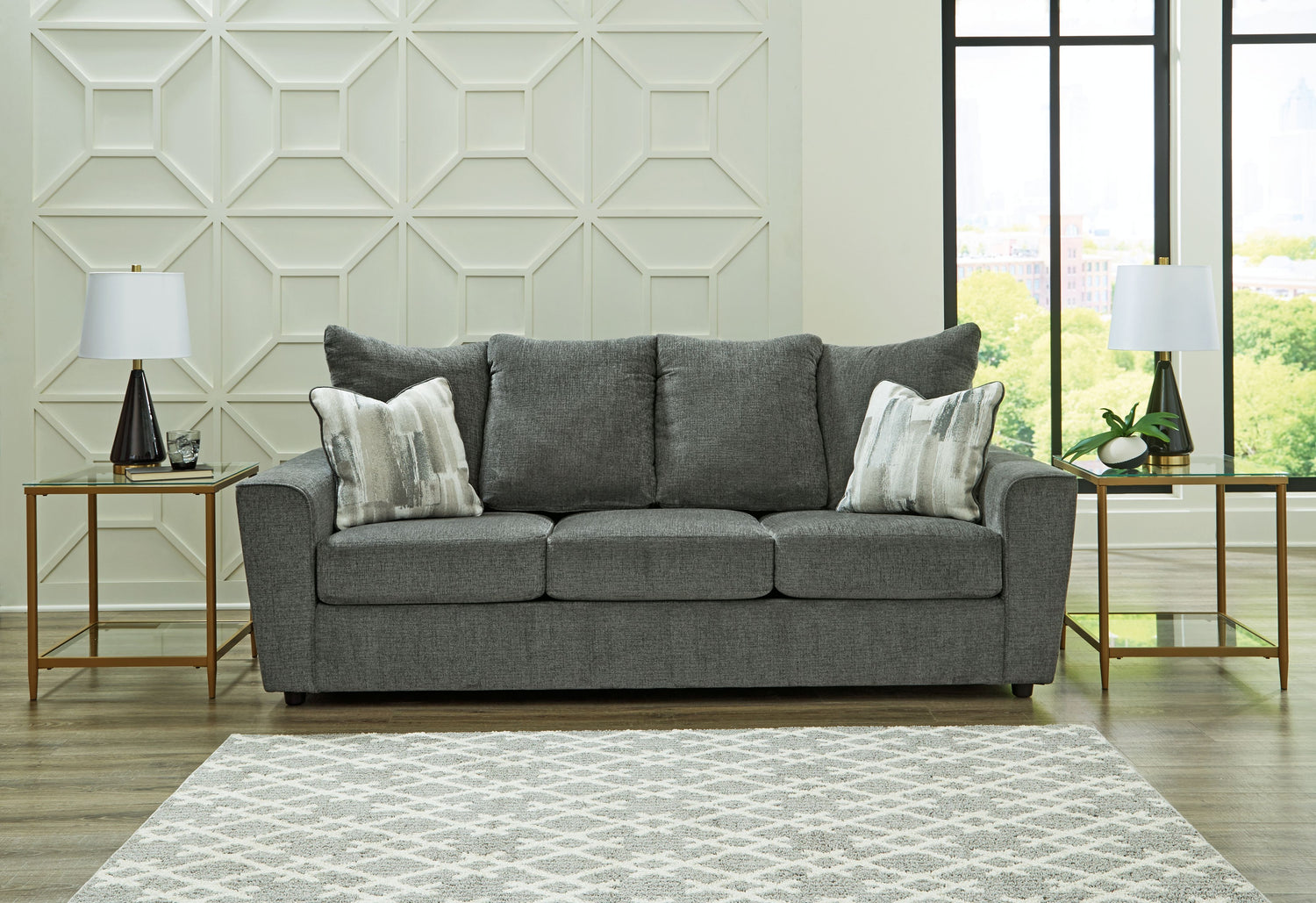 What’s new in neutrals? Shades of gray, of course. Embrace the sophisticated design trend with this gorgeous sofa that offers a clean-lined, contemporary style at a comfortably cool price. Sure to lift your spirits, the plush chenille fabric is fabulously neutral. Contemporary flared arms give it a distinctive flair. This sofa also arrives with two cool brushstroke accent pillows to elevate the taste and comfort level.