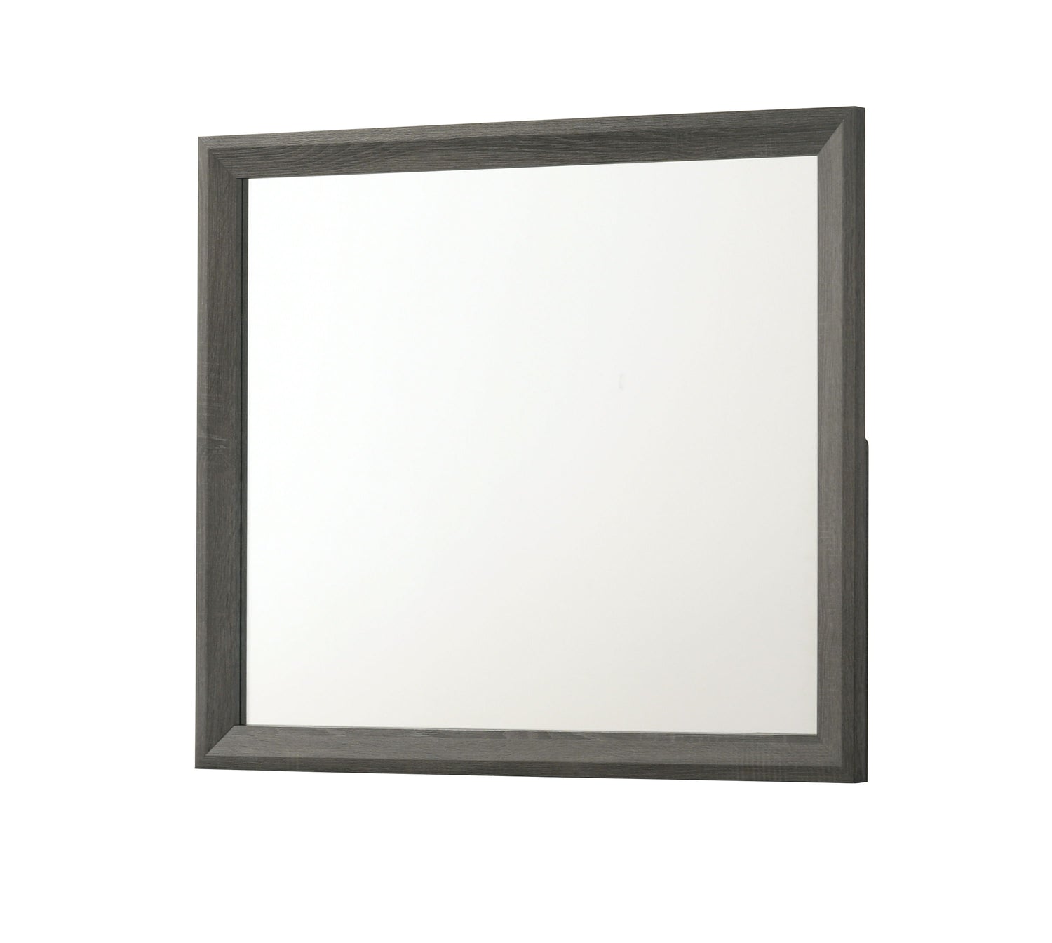 This bedroom collection encapsulates a blend of contemporary design and rustic charm. The centerpiece, a bed with a distinguished chevron patterned headboard, evokes a sense of craftsmanship and texture, infusing the space with character. Flanking the bed are matching pieces, each exhibiting clean lines and a finish that suggests a lived-in elegance. The dresser, complemented by a substantial mirror, along with the tall chest, offer ample storage solutions with understated metal handles that enhance the modern farmhouse aesthetic. A nightstand completes the set, its compact design making it a practical addition to the suite.